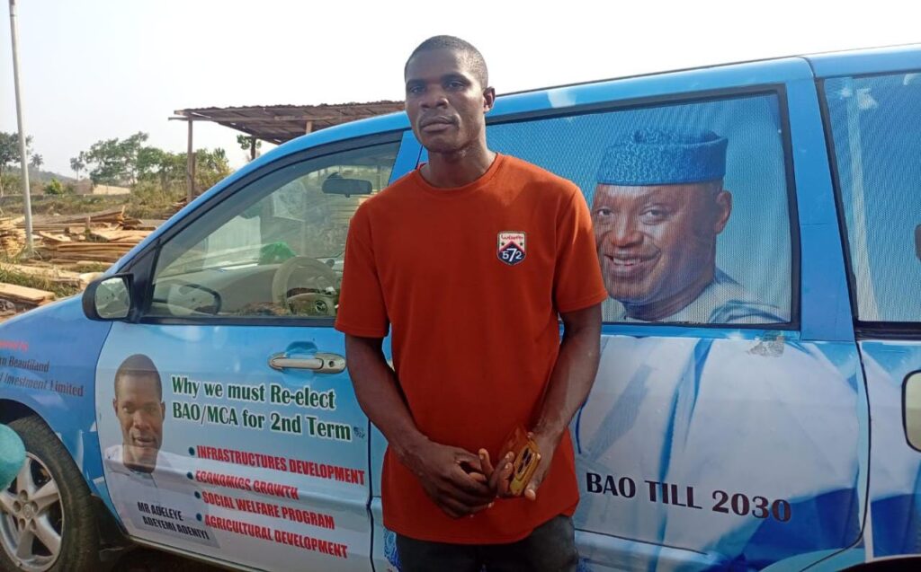 An ardent supporter of Governor Biodun Abayomi Oyebanji of Ekiti State, by the name Adeniyi Adeyemi Adeleye, who drives a mini truck to carry planks from BAO Timber Market located at Adewusi in Ado Ekiti, from where he earned his living has reportedly obtained a loan with monthly interest to buy and brand a space bus, donating same for the Governor’s campaign activities.